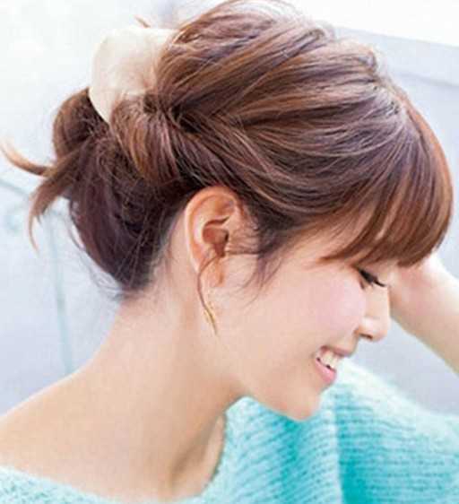 扭转发束的盘发设计,透出清新可爱的韩系气息,松散凌乱的发丝又是自然慵懒的美态,碎薄的齐刘海看起来相当舒适清甜。