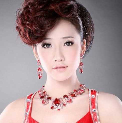 甜美系的新娘脸孔,当搭配上一款这样的中式复古系盘发下,卷曲蓬松刘海和高耸发髻,佩戴精美的红色水钻发饰,高贵干练气场十足。