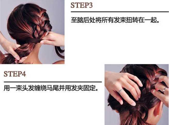 step4:图示,取出一束头发缠绕在马尾上,用黑色夹子固定发尾。