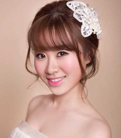 韩系十分甜美的一款盘发发型,简单的盘发搭配上稀薄的齐刘海,在粉嫩妆容的提亮后,立马变身温柔迷人形象。