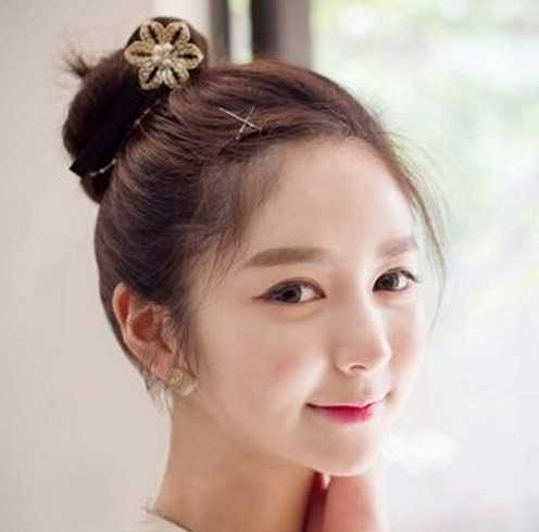 清爽露额的韩系花苞头盘发发型,无刘海的设计下,却能尽显出女生的清甜秀气迷人感,简单的发饰装点,淑女范也就出来啦!