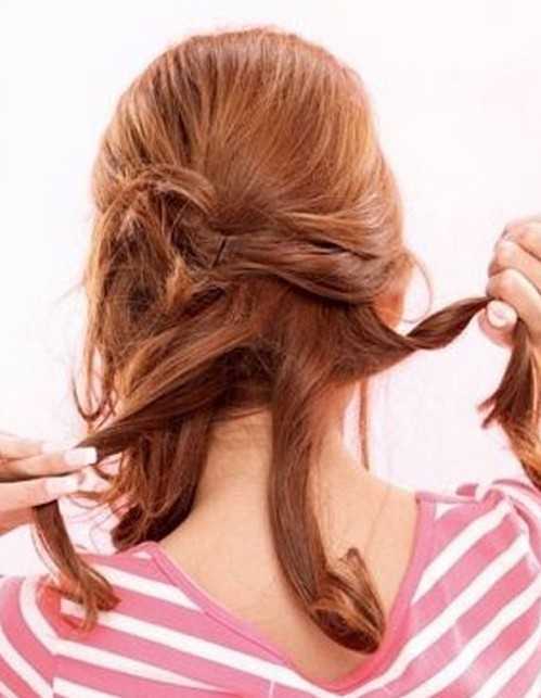 2、然后将剩余散落在中间的头发再分为三部分,再分别向外拧成卷,最后固定在一侧位置上。