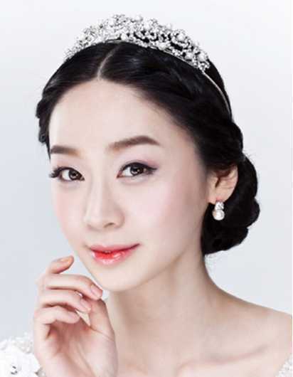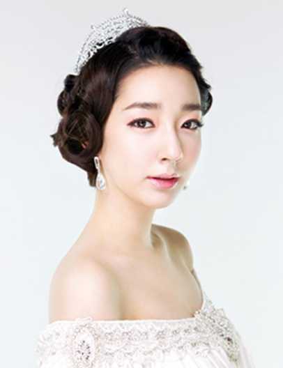 将一头卷发盘起来,很唯美的浪漫新娘发型,搭配上精致的皇冠发饰,加上露肩的婚纱裙,犹如女王般高贵,韩国最新流行的新娘盘发。