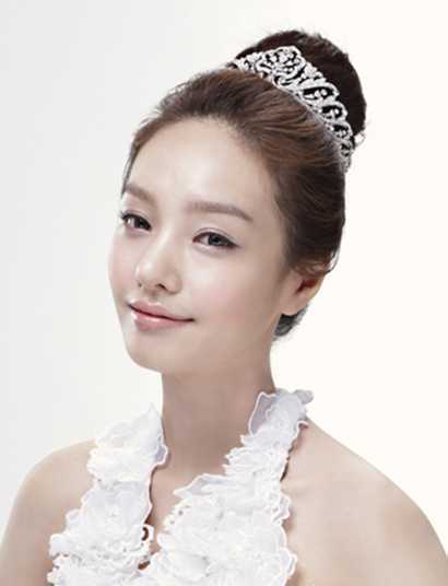高高盘起的花苞头盘发,无刘海,很清爽有木有?水钻皇冠架在头发上,瞬间将高贵气质展现,韩国最美丽的新娘盘发。