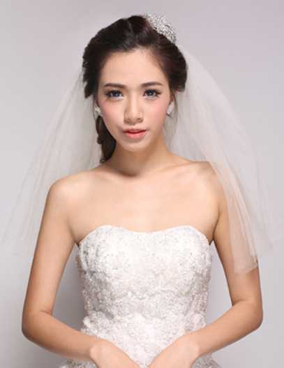 有点蓬松的编发扎发,低盘起来,加上头纱后,浓郁的新娘气息展现,增添上皇冠后,更是美丽大方。