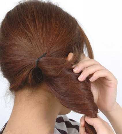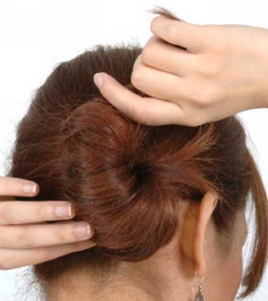 4、接着绕着头发根部将辫子盘出丸子头的形状,并使用夹子固定好位置。