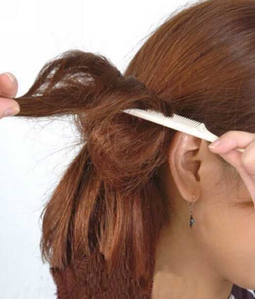 2、使用细齿梳把马尾发辫倒梳营造蓬松效果。