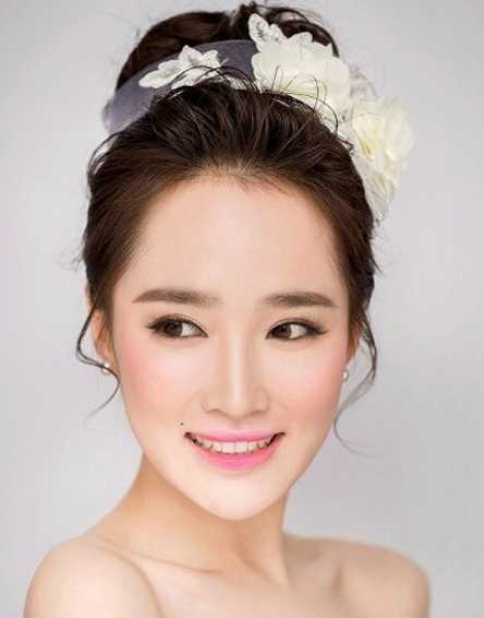 超粉嫩的妆容,瞬间点亮新娘子好气色的效果,优雅的花苞盘发,两侧几缕卷发丝的摆放,再点缀上花朵头饰,这样的造型后,你就是最甜美最温婉的形象了。