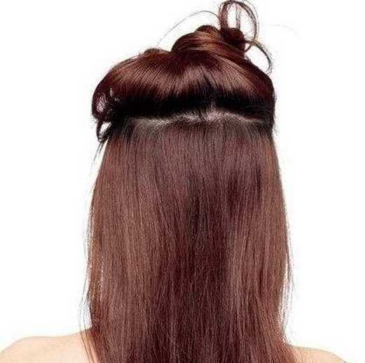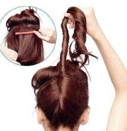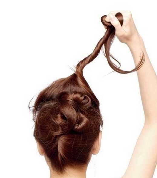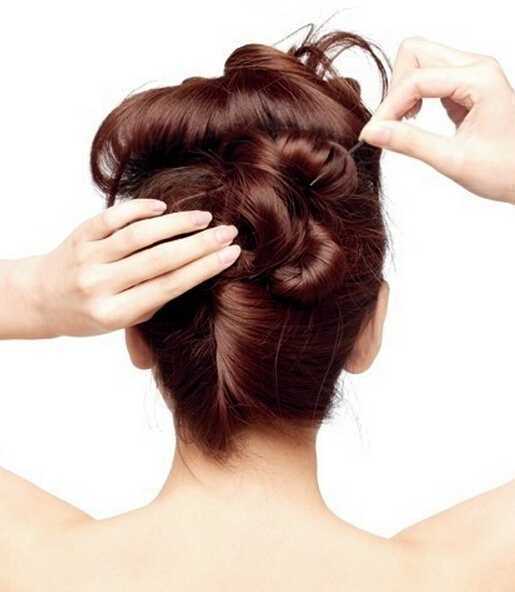 3、然后把发尾回折交叉盘旋在头后部,使用小竖夹固定好,注意盘出发髻形状。