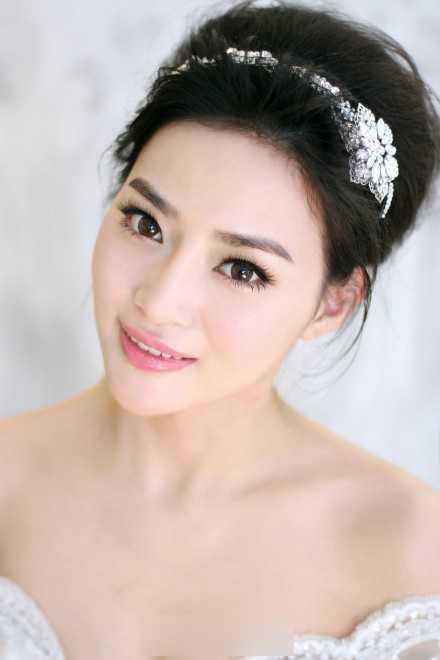 这款看起来高贵的新娘发型,选择蓬松精致的花苞发髻盘发,再搭配水钻发箍,无刘海的头发设计,显甜美妆容,整体看起来十分气质。
