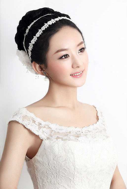 简约却显美态的新娘造型,整体高扎的发髻盘发,清爽又知性好看,双蕾丝发带装扮后,再配个甜美妆容,好看极了。