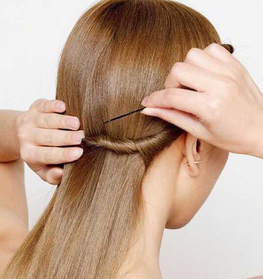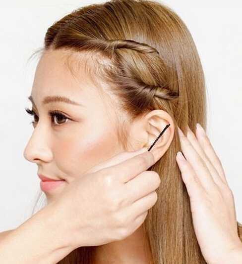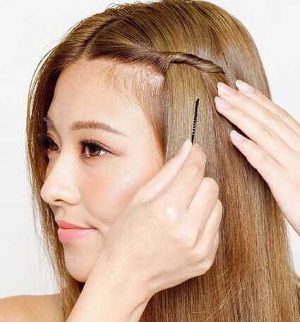 步骤一:先把发型分为中分刘海设计,再在左侧刘海边缘的一缕发丝顺时针向后拧转,并用发卡固定。