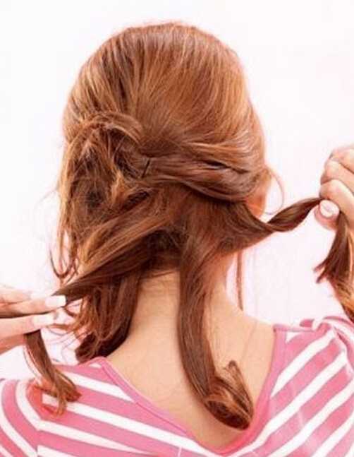 2、然后把剩余的头发分为三束,再分别往外扭转卷曲效果。