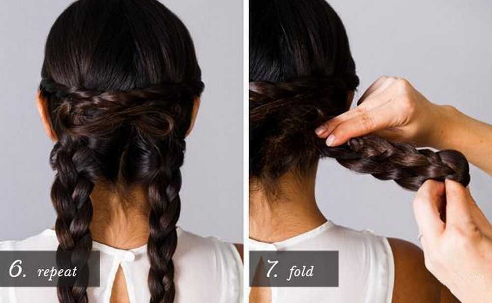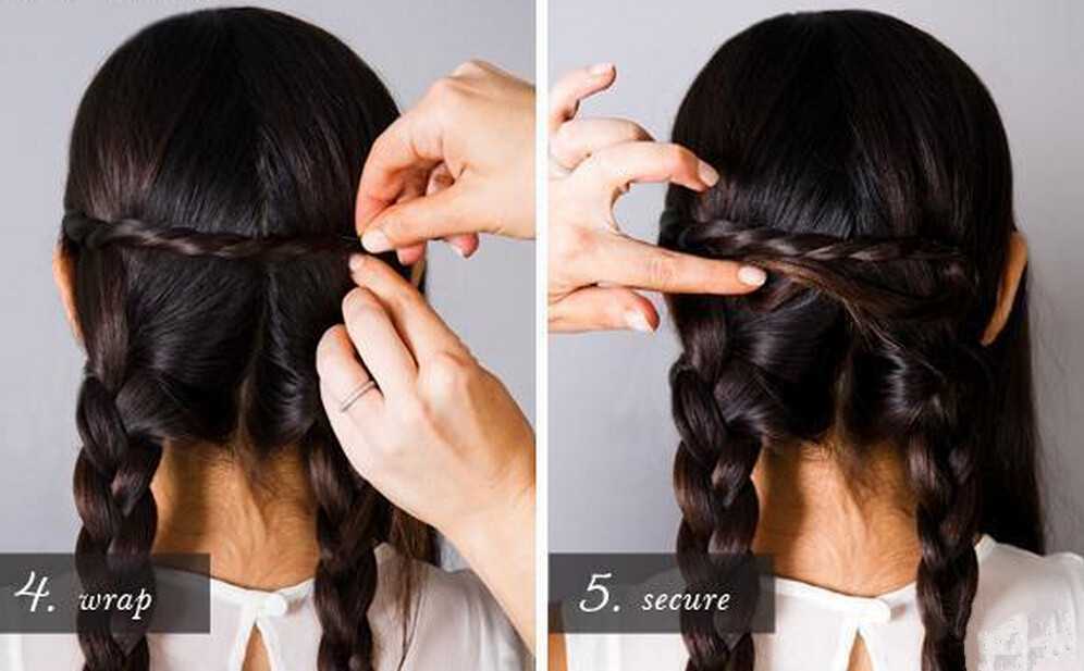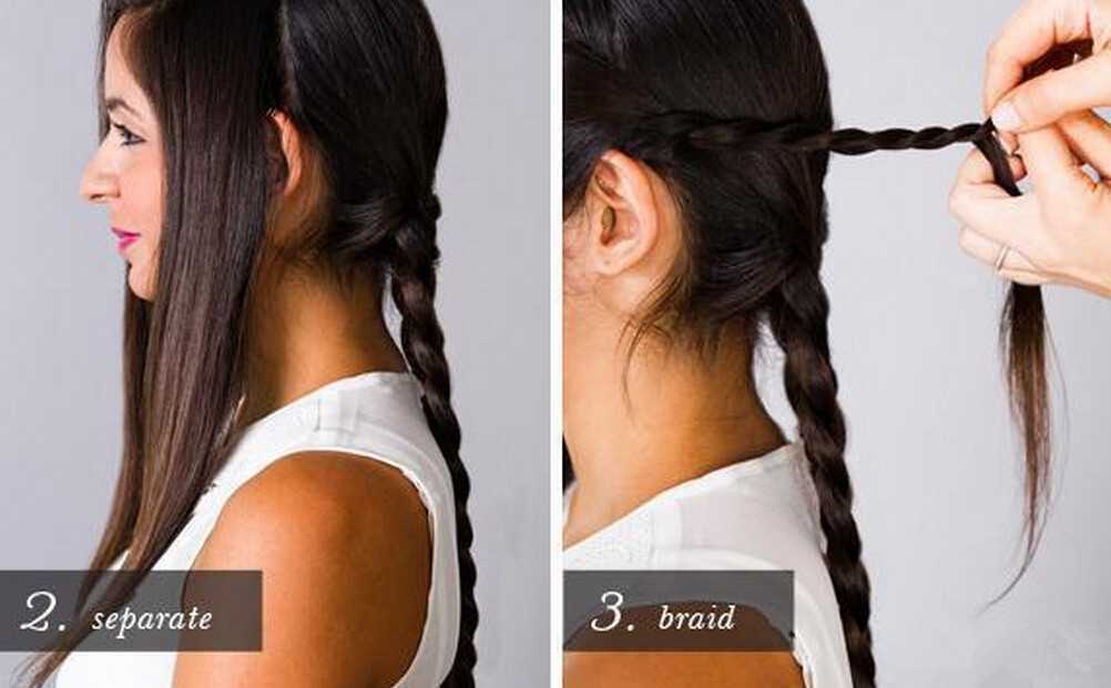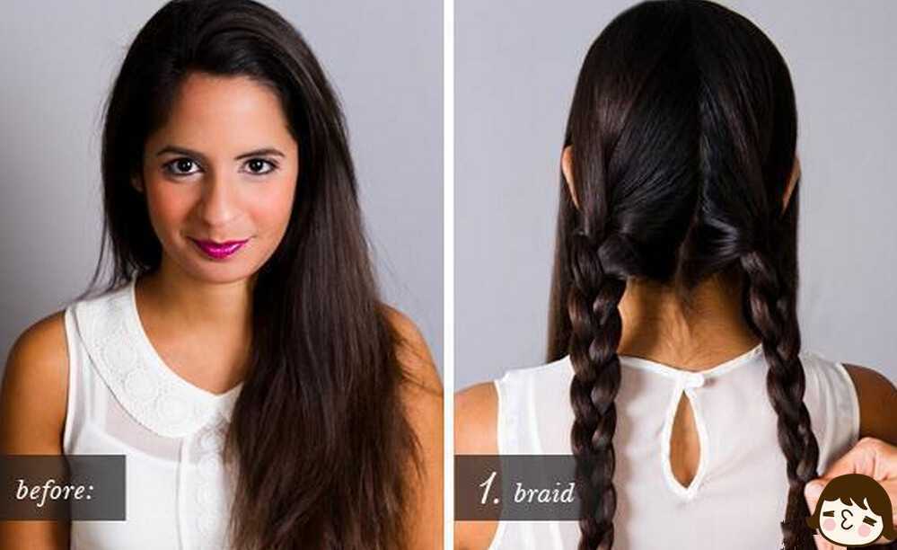 步骤一:将两边的长刘海部分留出来,然后中分剩下的头发,并将它们编成两条麻花辫。