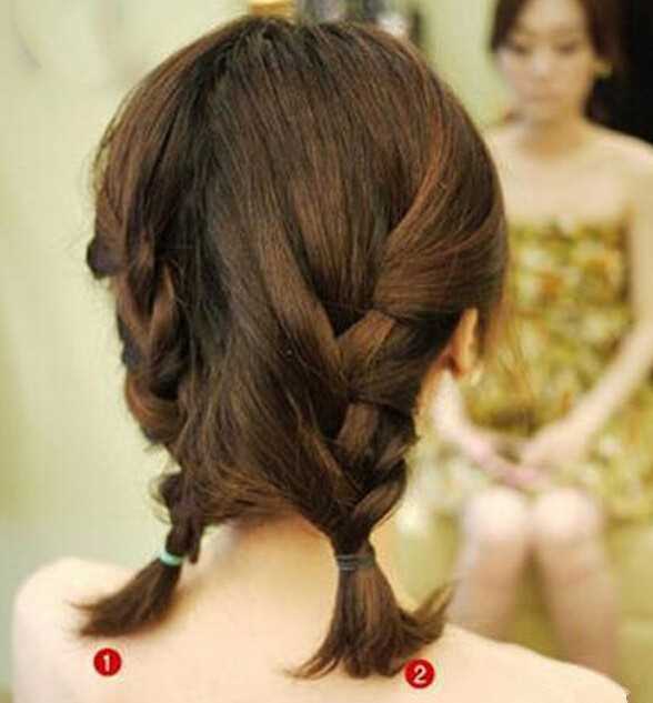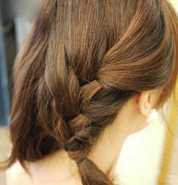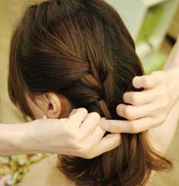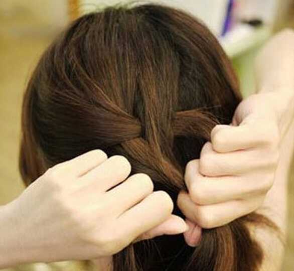 步骤八:然后把两根辫子交叉往发根处发收尾藏起来,用小黑夹固定好。