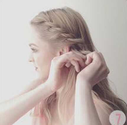 步骤6、将左侧刘海分成两股,交叉缠绕,扭成麻花,在耳后位置用发夹固定好;