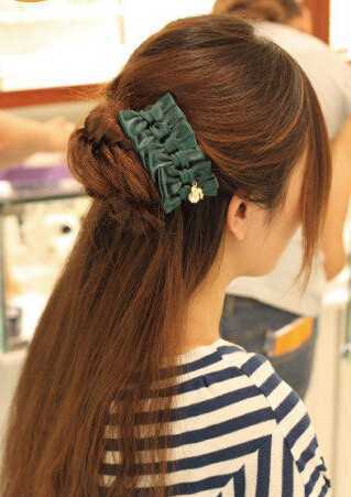 一款十分简单优雅的韩式鱼骨辫盘发,半扎发的设计营造出甜美淑女范,蓬松饱满的辫子盘成一个圈,搭配发卡装饰更显精致好看。