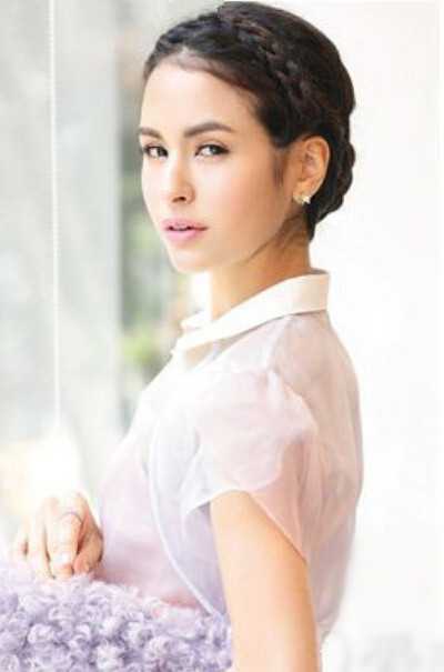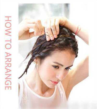 步骤四:将刘海处的两条发辫交叉缠绕成发箍状,接着用发夹固定好。