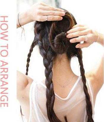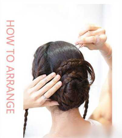 步骤三:将两边的两条辫子顺着发髻缠绕起来,同样用黑色发夹固定。
