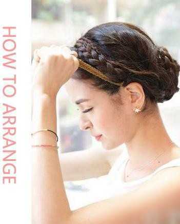 步骤六:将发带其中的一条线盖住辫子,令辫子发箍更加服帖,最后再稍微调整一下就完成了。