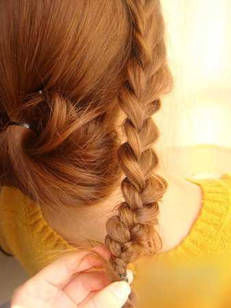 步骤十:发辫编到耳朵位置时,换回麻花辫的编法,一直编到发尾处。