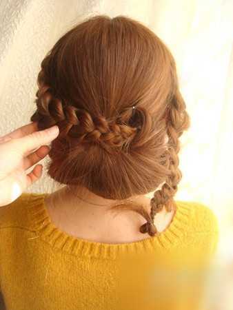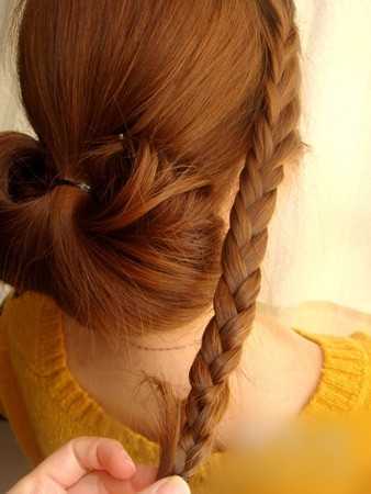 步骤十二:左侧的头发按照同样的方法编发,编好后将辫子拉至右侧,选择好位置后用发夹固定住。