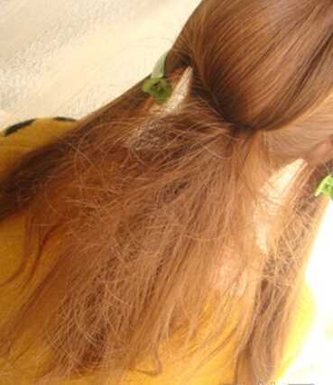 步骤六:将弯曲的头发向两边拉开成扇状,用夹子固定。