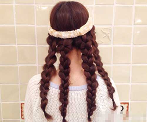 步骤四:将麻花辫向上对折,再向下穿过发带,然后绕着发带盘起来;