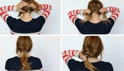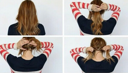 新娘盘发教程02》》》》》绑好马尾之后,将马尾上方轻扯开来,将剩余马尾的头发向上穿进刚扯出的洞里(如图)