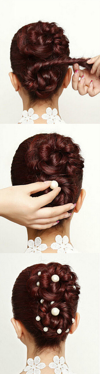 【新娘盘发step05】这时两股麻花辫就形成了两个优雅的盘发造型,再将新娘盘发配饰中的花朵或者珍珠,为盘发再添装饰就可完成这款优雅的新娘盘发。