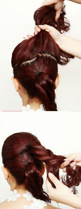 【新娘盘发step03】编好之后,同样利用一次性橡皮圈固定好,再将麻花辫盘旋卷曲在发型上(如图)用一字夹稳固固定即可。