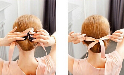 【盘发器使用step05】再托着整个盘发造型,轻轻拨松之后再将两侧的发带绑成一个蝴蝶结的造型,注意在绑法的过程中一定要紧实一些。