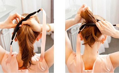 【盘发器使用step02】再将事先准备好的海绵飘带盘发器轻轻套入马尾之中。