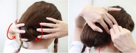 【盘发教程step04】然后,将刚编好的麻花辫围绕着盘发的造型从发型的尾部进行固定,也是利用一字夹固定即可。