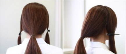 【盘发教程step03】中间的秀发利用橡皮圈扎起之后,将脑后的秀发不断的重合内扣(如图)用一字夹将其一一固定起来。