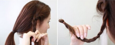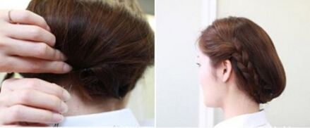 【盘发教程step02】接着,取出右侧的秀发编成三股辫,然后发尾卷曲固定,再取出左侧的秀发采取同样的方式编成三股辫后再固定。