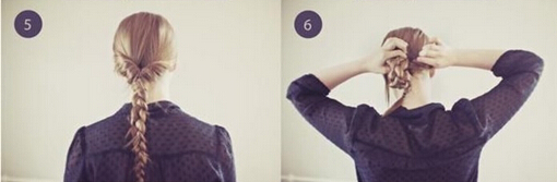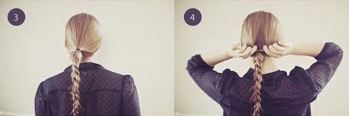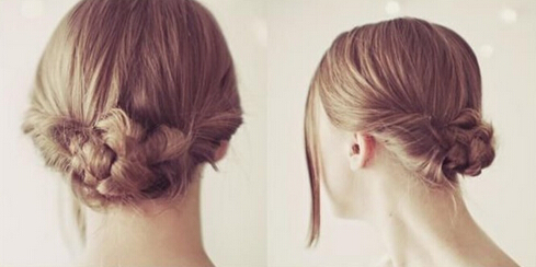【韩式盘发step04】最后,将剩余的麻花辫向上盘绕在橡皮圈固定的位置,利用一字夹固定好即可。