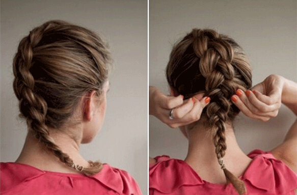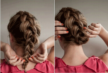 【盘发教程step04】然后,将发尾部分从往右上方进行弯曲盘旋(如图)藏于大辫子的内侧并加以发夹固定。