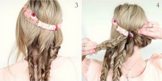 【盘发教程step02】接着,将发带下方的秀发按照自己的实际情况分成三份,并将其编织成麻花辫。