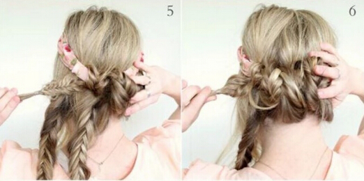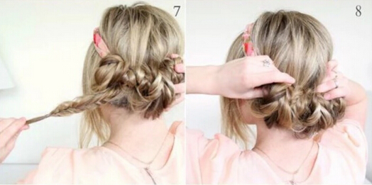 【盘发教程step04】第一条辫子缠绕两圈之后,将第二条辫子也是围着发带缠绕两圈,然后把最后的一条辫子也是利用同样的方法缠绕(如图)知道将所有的发尾都缠绕盘成一个低盘发造型即可。