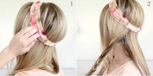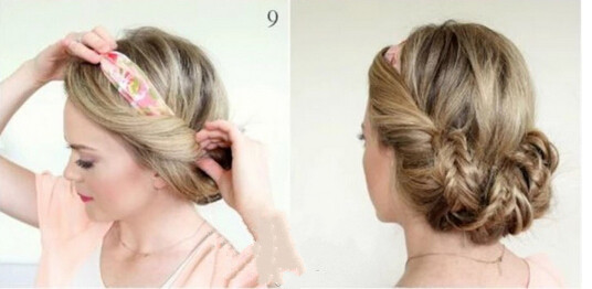 【盘发教程step03】将编好的麻花辫轻轻扯松后,把右侧第一条围着发带的位置不停缠绕两圈。