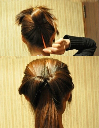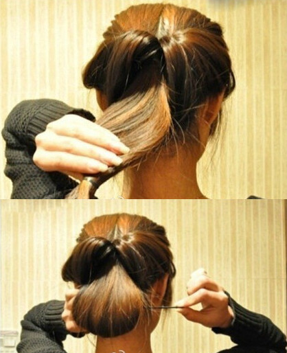 【韩式盘发教程step02】接着,把尖齿的盘发器从马尾的前方由下往上的穿过(如图)再使劲将马尾的秀发穿过里侧往下拉(如图)