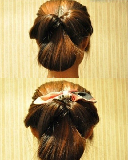 【韩式盘发教程step03】这时,内翻的扎发造型已经成型了。利用橡皮圈将发束的发尾先固定好。