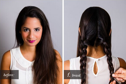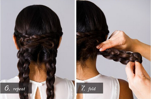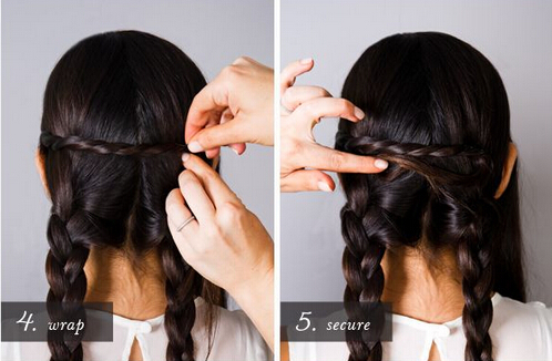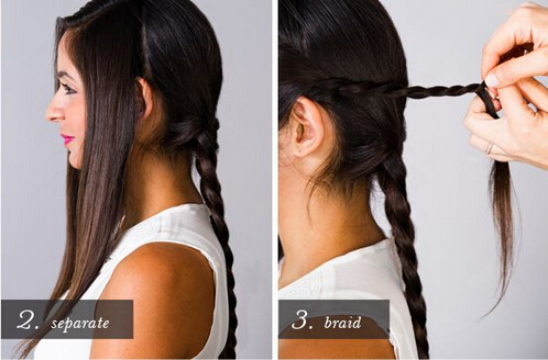 【盘发教程step02】接着,将脑后的两份秀发分别编制成麻花辫的造型(如图)然后用橡皮圈固定即可。