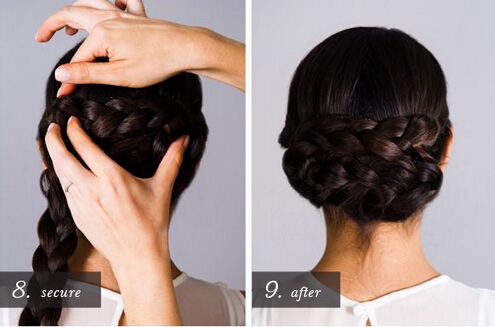 【盘发教程step04】然后,将右边的大麻花辫也对折起来,弯曲地盘旋在发型中间(如图)利用U型夹固定。