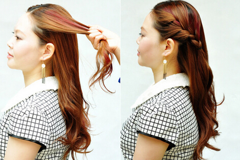 【花苞头盘发step01】首先梳理好秀发之后,在左侧取出三缕秀发,编出三股辫然后利用皮筋固定即可。