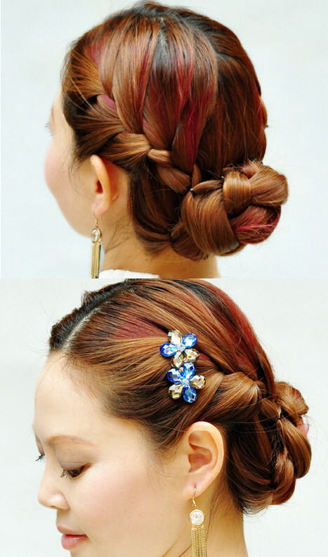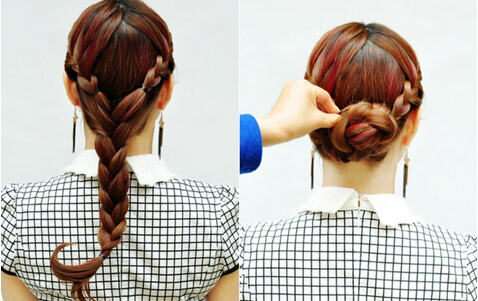 【花苞头盘发step04】然后,将三股辫从下往上卷起,弯曲盘旋在发际线处,将发梢藏在盘发中,再利用一字夹固定好两侧,为了发型的饱满,可以再轻扯脑后的秀发。