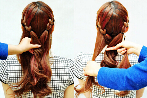 【花苞头盘发step02】接着,右侧也是采取同样的方式来进行编发即可。然后再与剩下的秀发合在一起,再进行三股辫的编发。
