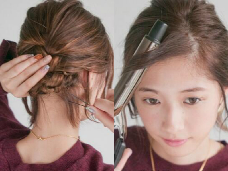 尔后我们要将发尾往上卷起,藏于头发中,使用发夹固定好,最后我们使用卷发棒打理一下刘海,让其看上去更整洁大方即可。