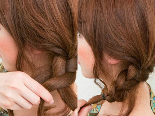 然后将头发移到一侧,扎成蓬松的侧麻花辫,使用橡皮筋固定好发尾。